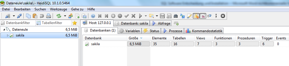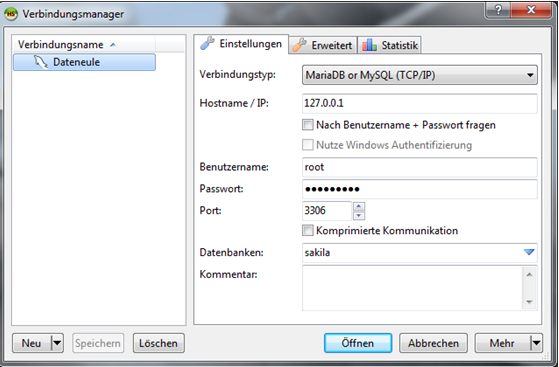 Anschließend noch die Datenbank „Sakila“ auswählen, die bei der Installation von HeidiSQL als Beispieldatenbank mitgeliefert wird, und den „Öffnen“ Button klicken.