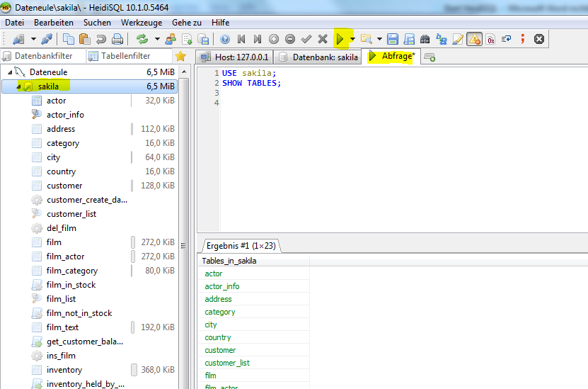 Als Ergebnis wird ein Reiter „Tables_in_sakila“ angezeigt. Die Auflistung der Tabellen erhältst du auch beim Aufklicken von der sakila Datenbank in der Datenbankstruktur links. Wie wir sehen hat die Datenbank 23 Tabellen: