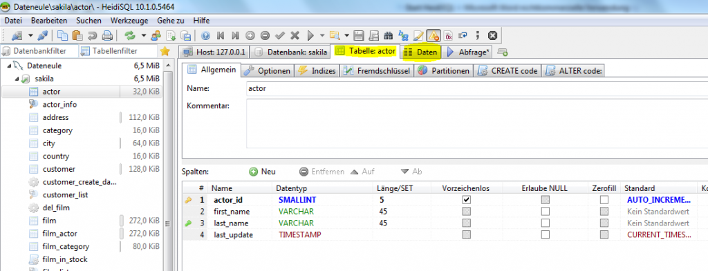 Die Eigenschaften einer Tabelle kannst du dir durch einen Doppelklick auf die Tabelle „actor“ in der Datenbankstruktur links anzeigen lassen. Es werden 2 zusätzliche Reiter „Tabelle“ und „Daten“ angezeigt: