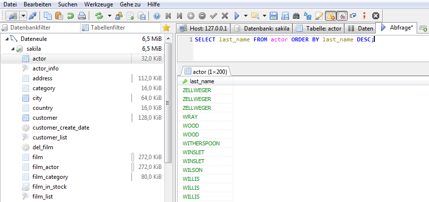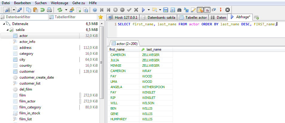 Lassen wir uns z.B. alle Schauspieler mit dem Nachnamen „Willis“ ausgeben und dabei die Vornamen aufsteigend sortieren: