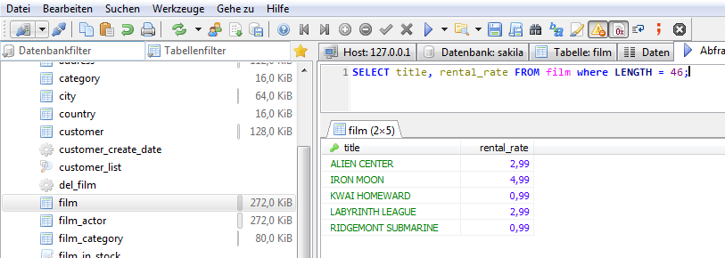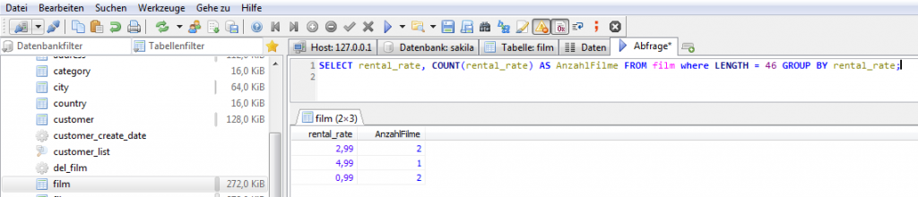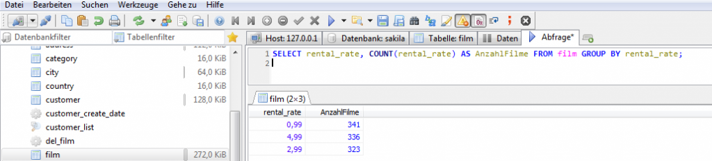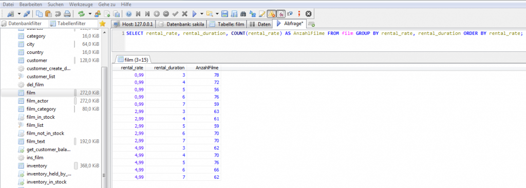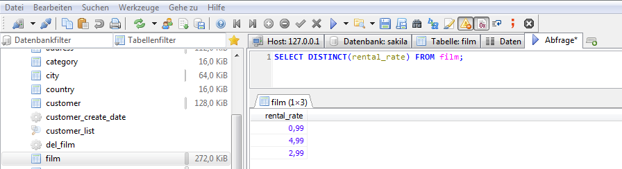 In der Tabelle „film“ haben wir Filme mit 3 verschiedene Leihgebühren: