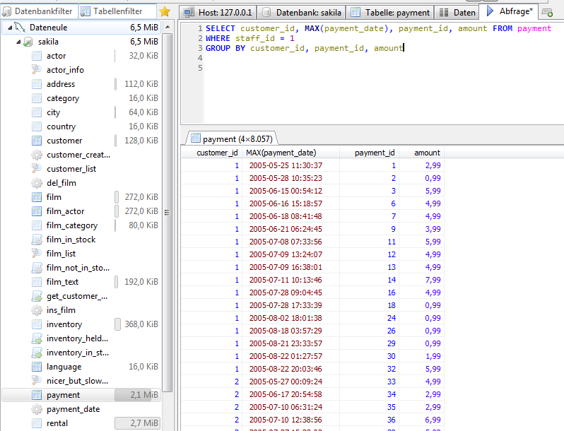 Hier werden uns nun allerdings alle Datensätze ausgegeben, in denen ein Kunde beim Verkäufer 1 einen Film ausgeliehen hat. Die Aggregatfunktion MAX des Ausleihdatums wirkt auf den kompletten Datensatz, sodass für jede individuelle Kombination aus customer_id, payment_id und amount das letzte Ausleihdatum beim Verkäufer 1 ausgegeben wird.