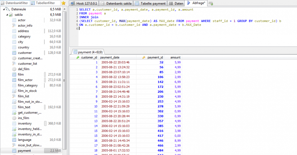 Im SELECT-Befehl können wir ganz normal unsere gewünschten Ausgabespalten angeben. Anschließend verknüpfen wir die Ausgangstabelle payment (ich vergebe hier den Alias a) und die virtuelle Tabelle der letzten Ausleihdaten (Alias b). Verknüpft werden die beiden Tabellen anhand der customer_id und dem payment_date. Da wir einen INNER JOIN ausführen wird nur die Schnittmenge der beiden Tabellen ausgegeben, also nur Datensätze mit einen letzten Ausleihdatum beim Verkäufer 1.