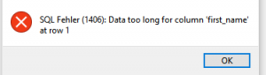 Beachte, wenn der Strict SQL Modus* standardmäßig aktiviert ist, werden keine ungültigen Werte in Insert- oder Updateanweisungen akzeptiert und es erfolgt eine Fehlermeldung bei dem Versuch Datensätze mit einer Länge > M zu laden: