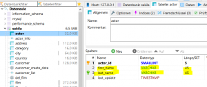 In unserer Testdatenbank sakila haben wir z. B. die beiden Spalten „first_name“ und „last_name“, die mit den Datentyp VARCHAR definiert sind, hier jeweils mit einer maximalen Länge von 45 Zeichen. Sobald versucht wird einen Datensatz mit einem Vor- oder Nachnamen mit mehr als 45 Zeichen hinzuzufügen werden alle Zeichen > 45 abgeschnitten.